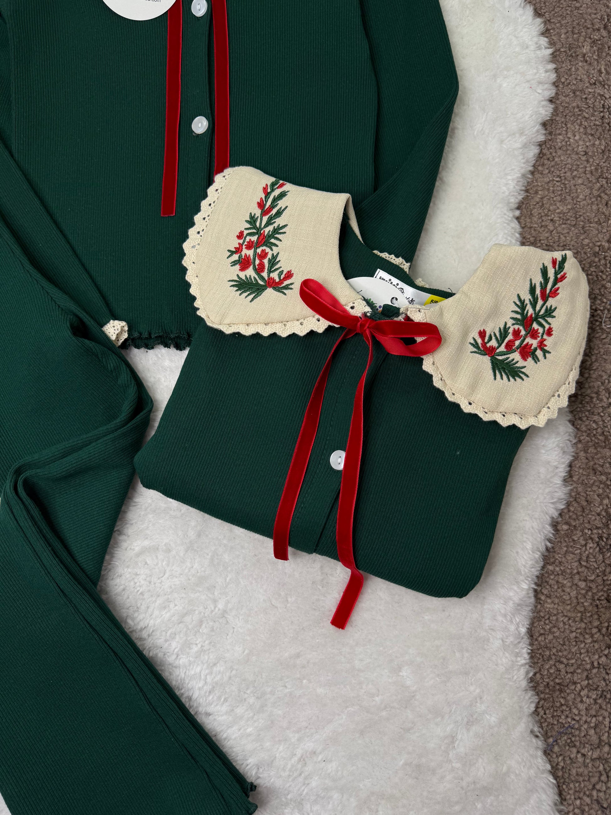 ENSEMBLE FILLE VERT À COL BRODÉ FLORAL